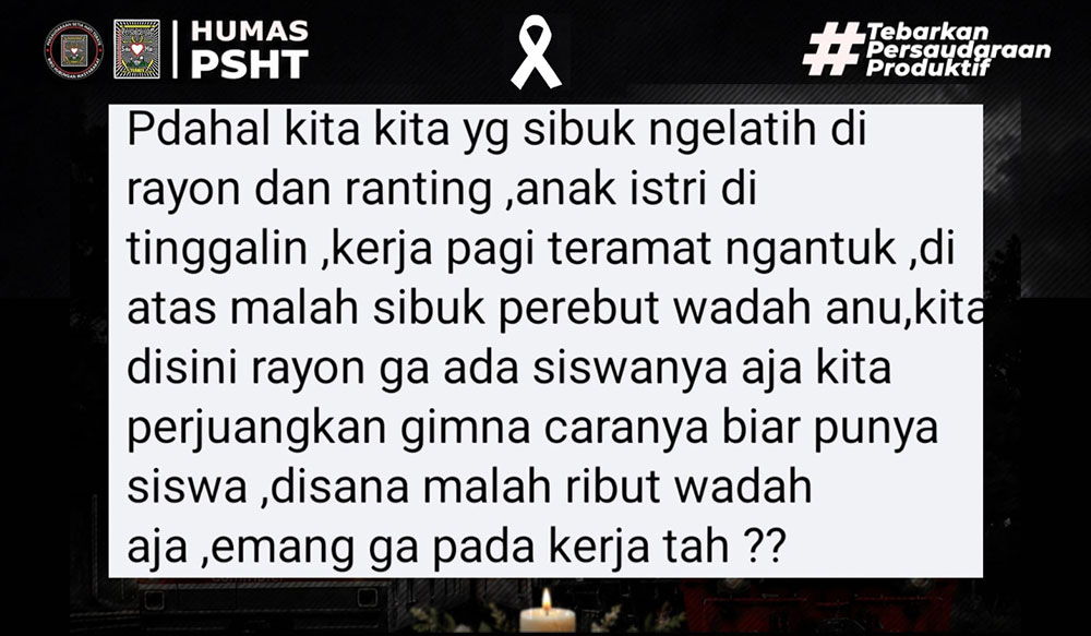 Ada pikiran ini di beberapa warga (anggota) PSHT, “Timbang nuruti wong nduwuran sing royokan balung, sakral sak morine di simpen sing apik… Fokus nyambut gawe, gawe masa depan anak bojo..!!” (Daripada nuruti maunya pengurus PSHT yang rebutan harta dan jabatan, seragam dan kain mori -ijazah wisuda PSHT- disimpan yang baik. Fokus aja kerja, untuk masa depan anak dan istri!).