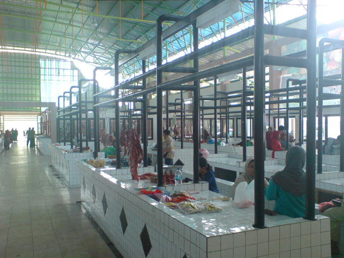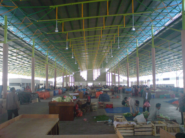 Memang luas sekali pasarnya. Ada 2 bangunan besar yang disebut los, atau saya rasa itu mirip bangunan untuk hanggar pesawat terbang. Di bangunan los pertama, saya jumpai pedagang-pedagang palawija dan daging (ayam, kambing dan sapi). Terdiri dari lajur-lajur memanjang yang berisi lapak-lapak pedagang. Produk agro yang dijual hampir sama seperti yang saya jumpai di pasar-pasar tradisional, cuma disini lebih bersih. Mayoritas, antara satu lapak dengan lainnya menjual produk palawija yang sama.
