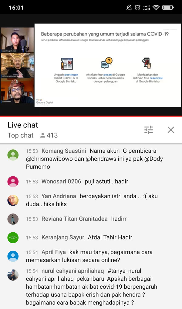 Keren ya, Bali – Jakarta – Makassar bertemu online dalam satu aplikasi Youtube Live Stream dan ditonton oleh masyarakat seluruh Indonesia. Ada kurang lebih 400 pemirsa di sesi kelas online itu. Alhamdulillah, semoga membawa manfaat buat kami dan pemirsa masyarakat Indonesia. Aamiin YRA.