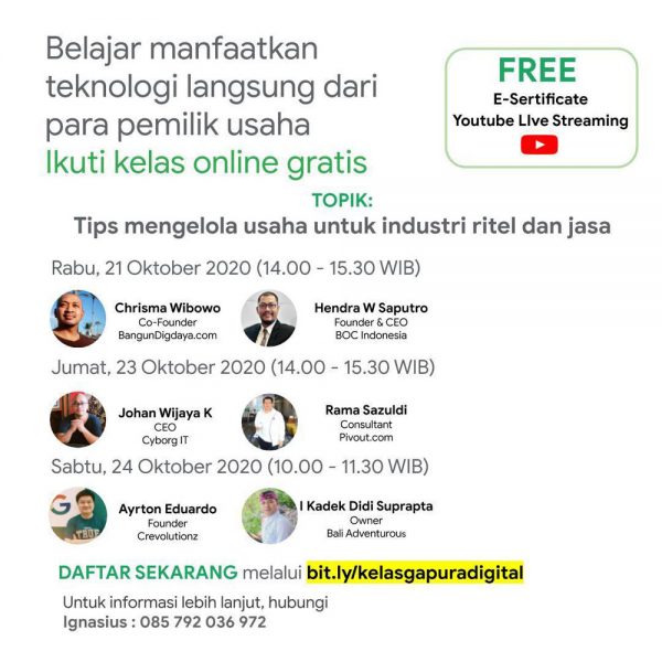 Pertemuan ke empat terjadi secara online! Lewat Youtube Live Streaming kami mengajar bersama sampaikan modul Tips Mengelola Usaha Untuk Industri Retail dan Jasa pada Rabu, 21 Oktober 2020 pukul 14.00 – 15.30 WIB.