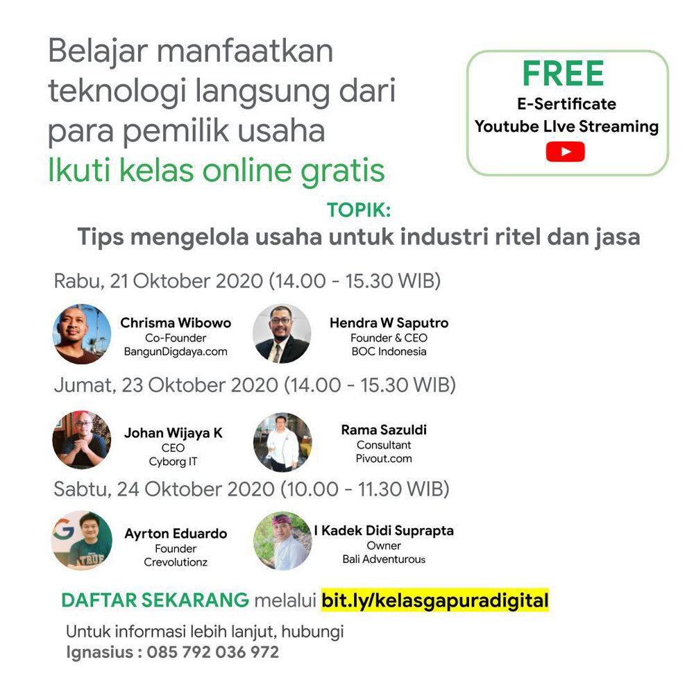 Dulu, program Gapura Digital terselenggara secara offline di 14 kota seluruh Indonesia. Salah satunya di Denpasar tempat penyelenggaraan Gapura Digital Bali yang kickoff pada 5 Agustus 2017. Sekarang, jaman pandemi corona per 21 Oktober 2020 kelas nya online live streaming.