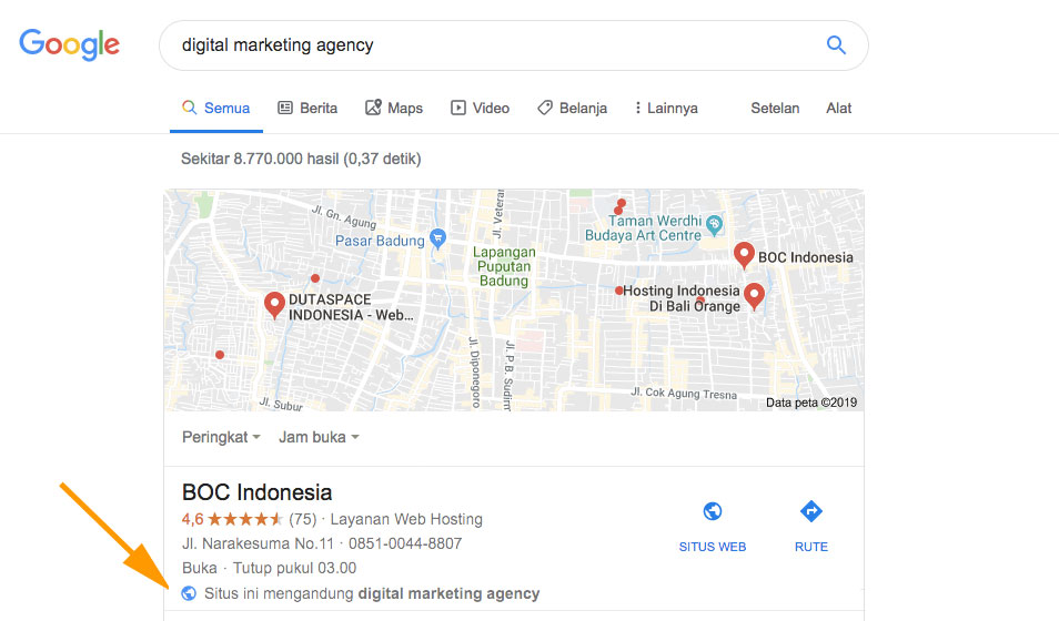 Satu lagi, Google juga akan menelusuri/merekam konten-konten dalam website yang dicantumkan dalam profil Google Bisnisku. Jika kata yang dicari oleh konsumen namun Google tidak menemukan dalam profil Google Bisnisku, maka Google akan ambil konten itu di website. Contohnya dibawah ini: