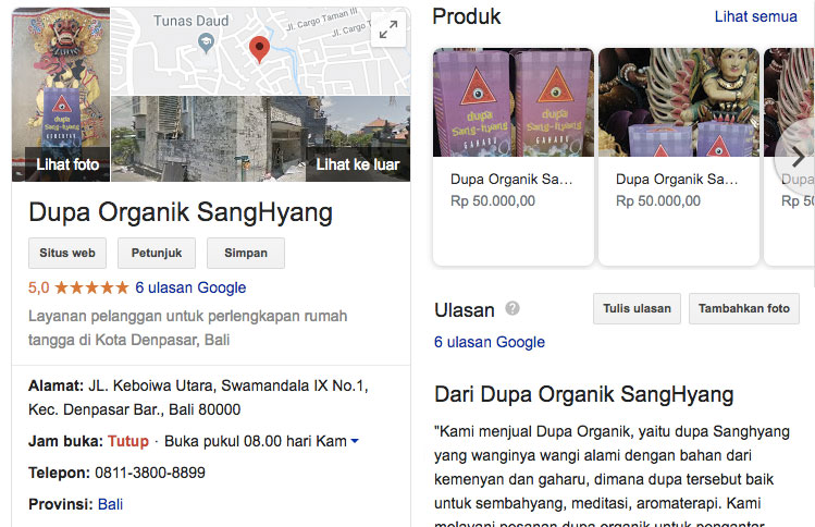 Kemudian ada Pak Rai. Bisnis nya baru 2 minggu membuat profil di Google Bisnisku dengan nama Dupa Organik SangHyang. Sudah mendapatkan 7 pelanggan yang membeli dupa. Pak Rai belumlah membuat website.