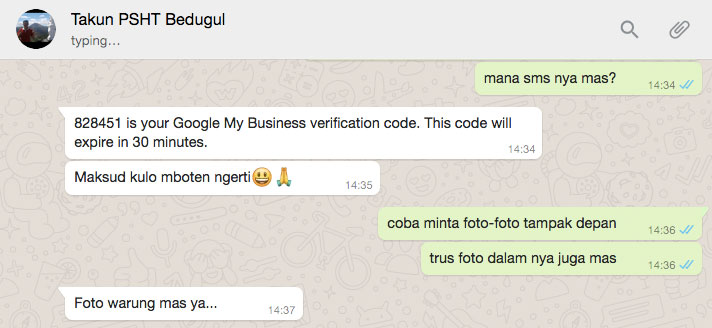 Saya klik link itu dan Google mengirimkan kode verifikasi ke nomor HP yang tertera. Mas Takun mendapatkan SMS dari Google berisi kode verifikasi. Kode itu saya masukkan ke halaman verifikasi. Selanjutnya profil Google Bisnisku sah dikelola oleh Mas Takun.