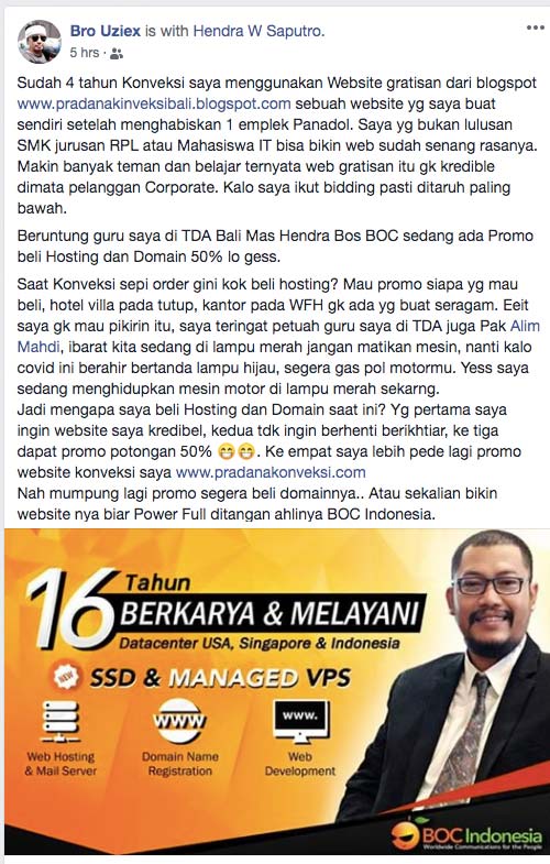 Untuk poin 1, Pak Bro mempunyai alasan kuat bela-belain beli domain dan hosting padahal situasi bisnis sedang krisis akibat pendemi Corona Covid-19. Saya pribadi kagum caranya dia aksi #lawancovid19. Nik simak aja kalimat nya Pak Bro di status FB nya: